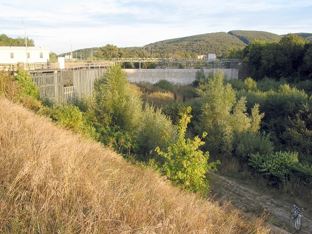 Wienfluss: Großes Rückhaltebecken mit Baumrechen flussabwärts
