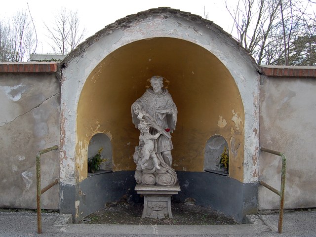 Ein Stück weiter in der Mauer wacht der Heilige Johannes Nepomuk und